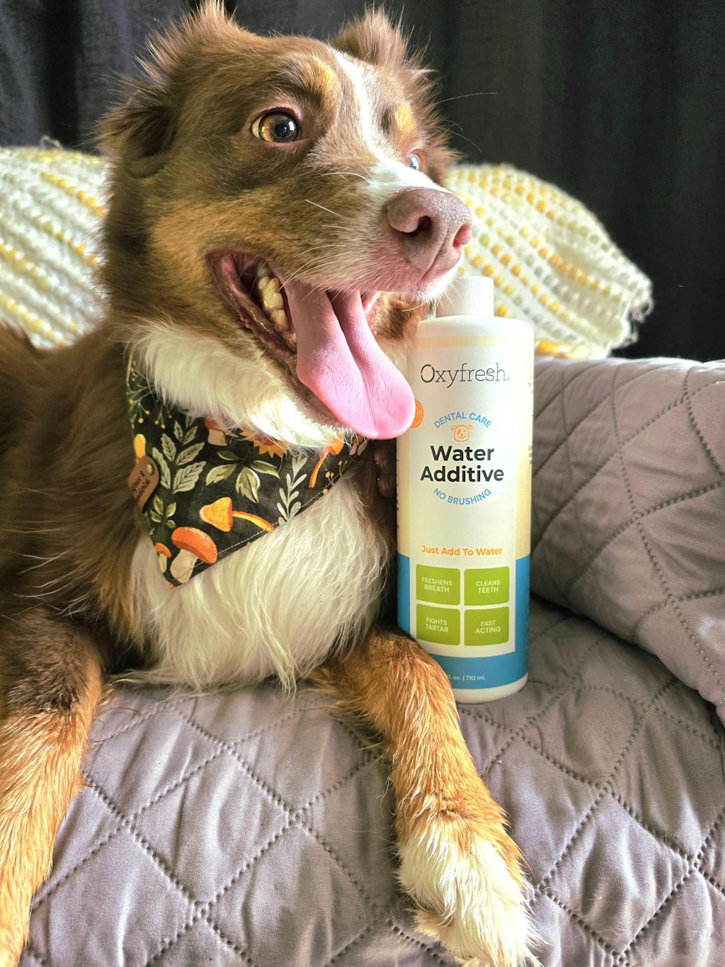 Thank you for sharing! We’re so glad Oxyfresh fits into your dog’s dental routine and helps keep her breath fresh without any taste. We truly appreciate you choosing Oxyfresh as part of her daily care!